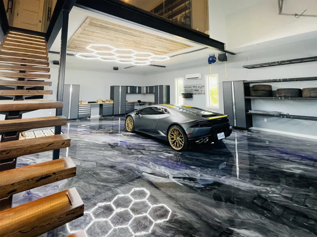 Metallic epoxy coatings create a stunning, three-dimensional effect that adds a touch of luxury to your garage.